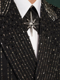 FOR SPRING-SUMMER 2025, HAND-PLACED CRYSTALS, BEADS, AND SEQUINS ILLUMINATE HOUSE SIGNATURE TAILORING SILHOUETTES IN A STRIPED GRADIENT EFFECT. THE CRYSTAL STRIPE DOUBLE BREASTED BLAZER IS CRAFTED WITH A WIDE NOTCHED LAPEL, WELT POCKETS, AND COVERED BUTTON CLOSURE. SPRING-SUMMER 2025 COLLECTION MADE IN ITALY 100% VIRGIN WOOL STYLE:AMSUFJ1098-001 SIZE & FIT MODEL IS WEARING SIZE "48" MODEL MEASUREMENTS: HEIGHT: 6'2.5" CHEST: 32" WAIST: 30" PRODUCT MEASUREMENTS (SIZE "48"): CHEST: 20.875" SHOULDER: 17.375" LENGTH: 31.25" SLEEVE LENGTH: 26.375" NORMAL FIT