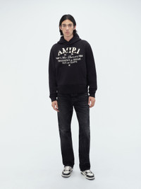 THE AMIRI LOGO MATERIALIZES IN A DESTROYED PATCH APPLIQUÉ TREATMENT ALONGSIDE ARTFULLY DISTRESSED EMBROIDERY ON THIS COTTON HOODIE. FEATURING A SPACIOUS KANGAROO POCKET, RELAXED FIT AND RIBBED FINISHES, THIS HOODIE COORDINATES SEAMLESSLY WITH HOUSE DENIM OR TROUSER STYLES. PRE-SPRING 2024 COLLECTION MADE IN USA 100% COTTON DRY CLEAN ONLY