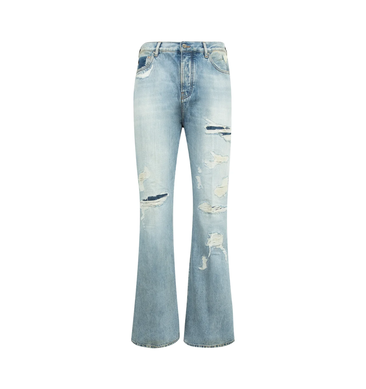 AMIRI Bootcut Jeans featuring heavy distressing, regular fit, five-pocket style, bootcut legs, button and zip fly and belt loops. Cotton. Made in Italy. DESIGNER STYLE ID: AMBMJE1031 COLOR: 747 CLASSIC VINTAGE INDIGO
