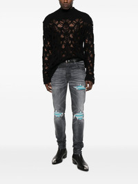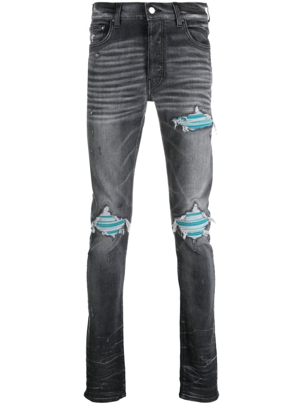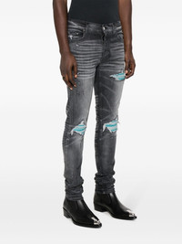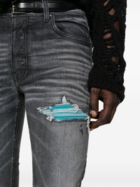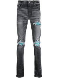 distressed skinny jeans Channelling its irreverent street-style aesthetic, AMIRI adds a distressed finish to these jeans. They're cut from stretch cotton denim to a skinny silhouette. Highlights - Grey - Stretch-cotton - Denim - Distressed finish - Whiskering effect at the thighs - Belt loops - Logo patch to the rear - Classic five pockets Made in United States Composition Cotton 92%, Elastomultiester 6%, Elastane 2% SIZE & FIT Model measurements Height 6 ft 0 in(1.84 m) Bust/Chest 35 in(89 cm) Hips 37.4 in(95 cm) Waist 28 in(71 cm) FittingInformation Designed for a skinny fit, these jeans offer a close fit throughout Constructed from stretch denim, this piece offers a stretch fit with durability This piece fits true to size – take your usual size
