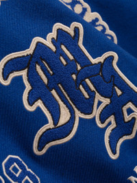 THE PRE-FALL 2024 MENSWEAR COLLECTION REIMAGINES VINTAGE COLLEGIATE ICONOGRAPHY THROUGH A HOUSE SIGNATURE LENS. THE DREAM TEAM VARSITY JACKET EMERGES THIS SEASON AS MIKE AMIRI'S PERSONAL TRIBUTE TO DREAMERS FEATURING CHENILLE APPLIQUE, CHAIN STITCH EMBROIDERY, AND CLASSIC SNAP BUTTON CLOSURE. PRE-FALL 2024 COLLECTION MADE IN ITALY SHELL: WOOL, SLEEVES: LEATHER, LINING: NYLON