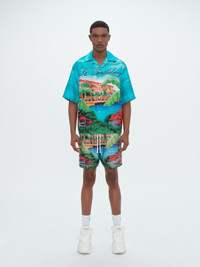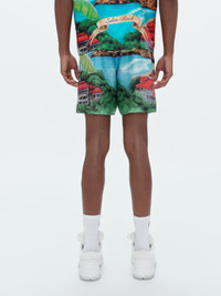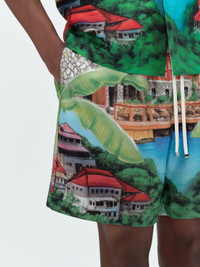 THESE SHORTS ILLUSTRATE IN VIVID COLOR THE LUSH TROPICAL IDYLL OF SAINT BARTHÉLEMY'S EDEN ROCK HOTEL. MADE IN SPECIAL COLLABORATION WITH THIS ICONIC LUXURY DESTINATION FOUNDED IN THE 1950S, THESE SHORTS IN FLUID SILK TWILL ARE ACCENTED WITH AMIRI DROP SHADOW LOGO AND FEATURE AN ELASTIC WAIST WITH DRAWCORD FOR EASE IN WEAR. MODEL IS 6'1" AND WEARS A SIZE MEDIUM MADE IN ITALY 100% SILK DRY CLEAN RECOMMENDED