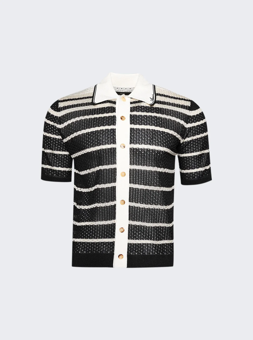 Details - Pointelle stitched knit button-down shirt - Short sleeves - Black and off-white stripes - Contrast tipping on the collar - House script logo on the collar - Material: 100% Viscose Size Information: Vendor Color Code: Brand Style: AMKNIR1038 Designer/Brand: AMIRI