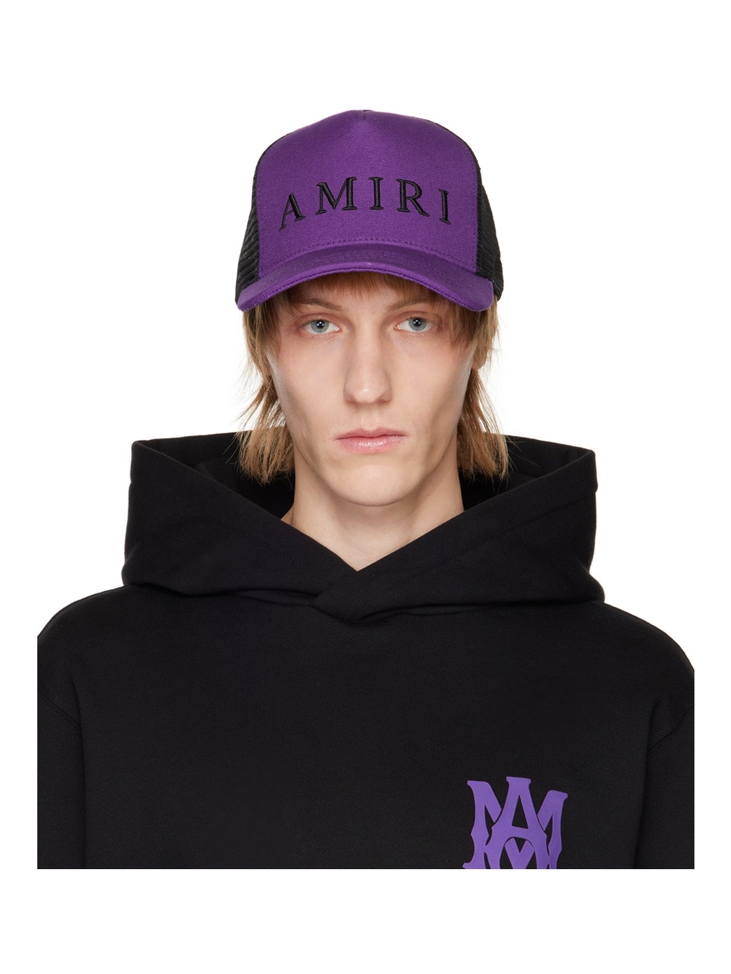 Paneled cotton canvas and mesh cap colorblocked in black and purple. · Curved brim · Logo embroidered at face · Leather logo patch at back face · Adjustable snapback strap at back face Supplier color: Brown/Canvas Body 1: 100% cotton. Body 2: 100% polyester.