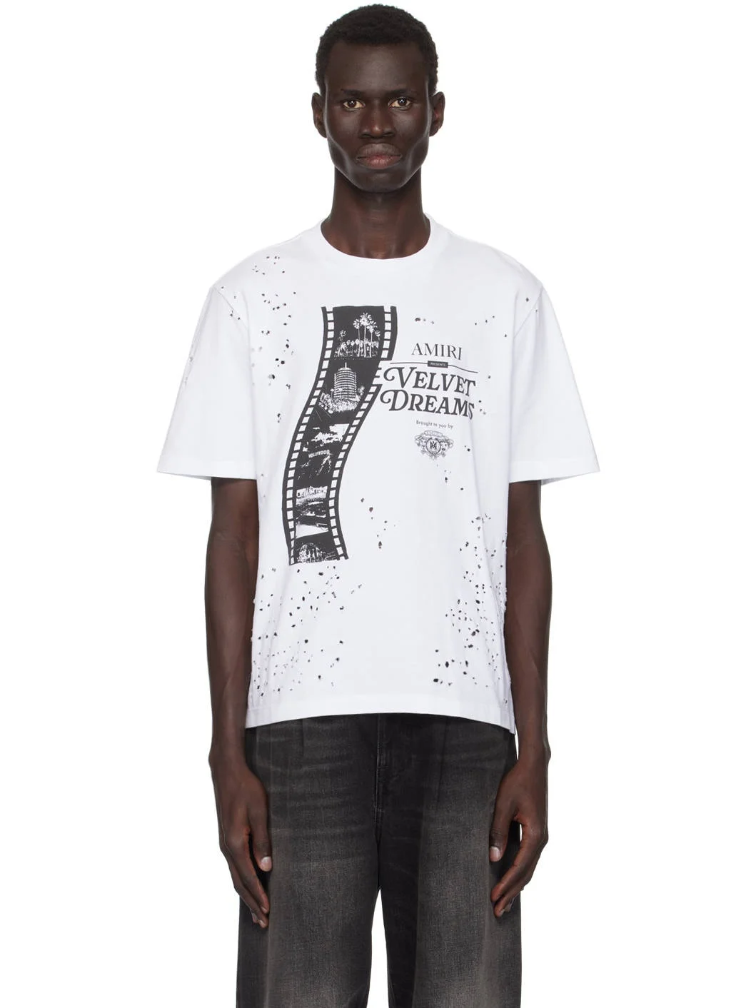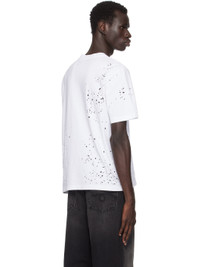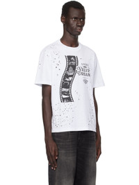 Cotton jersey T-shirt. Distressing throughout. · Rib knit crewneck · Logo, graphic, and text printed at front · Dropped shoulders Supplier color: White 100% cotton. Made in Italy 242886M213048