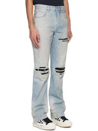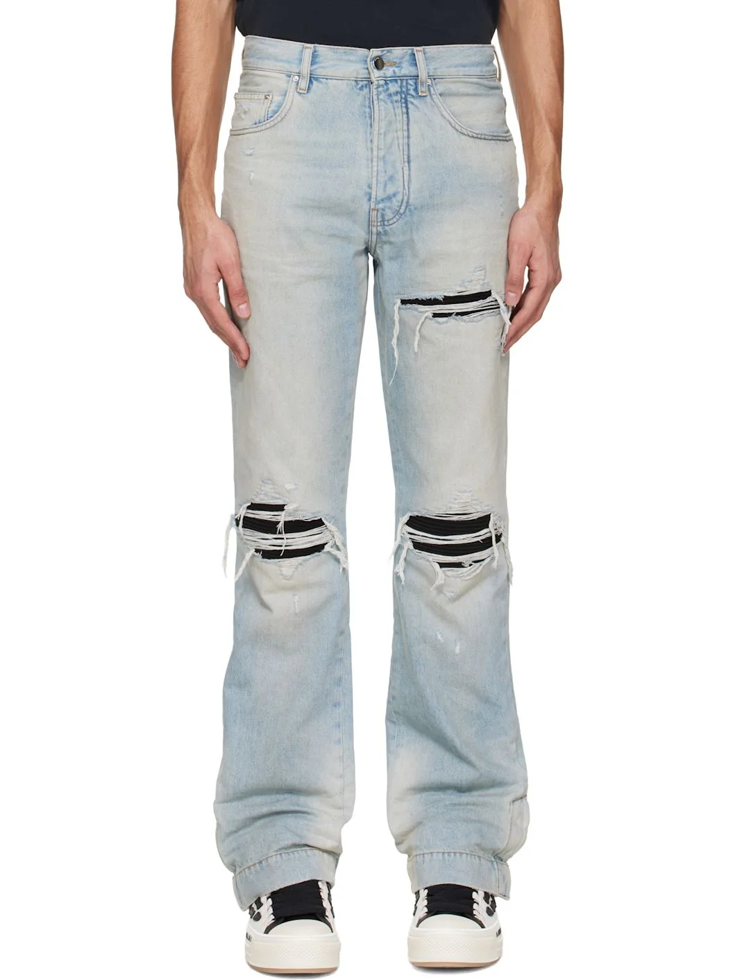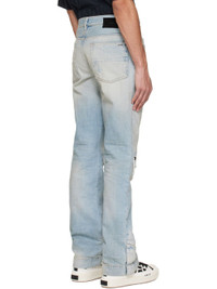 Non-stretch denim jeans. · Fading, whiskering, and hand-distressing throughout · Bootcut · Belt loops · Five-pocket styling · Button fly · Quilted faux-suede underlay at rips · Button vent at cuffs · Logo patch at back waistband · Logo plaque at back pocket · Logo-engraved silver-tone hardware · Contrast stitching in tan Supplier color: Mist indigo Body: 100% cotton. Trim 1: 80% polyester, 20% polyurethane. Trim 2: 65% polyester, 35% cotton. Made in Italy 261886M186013