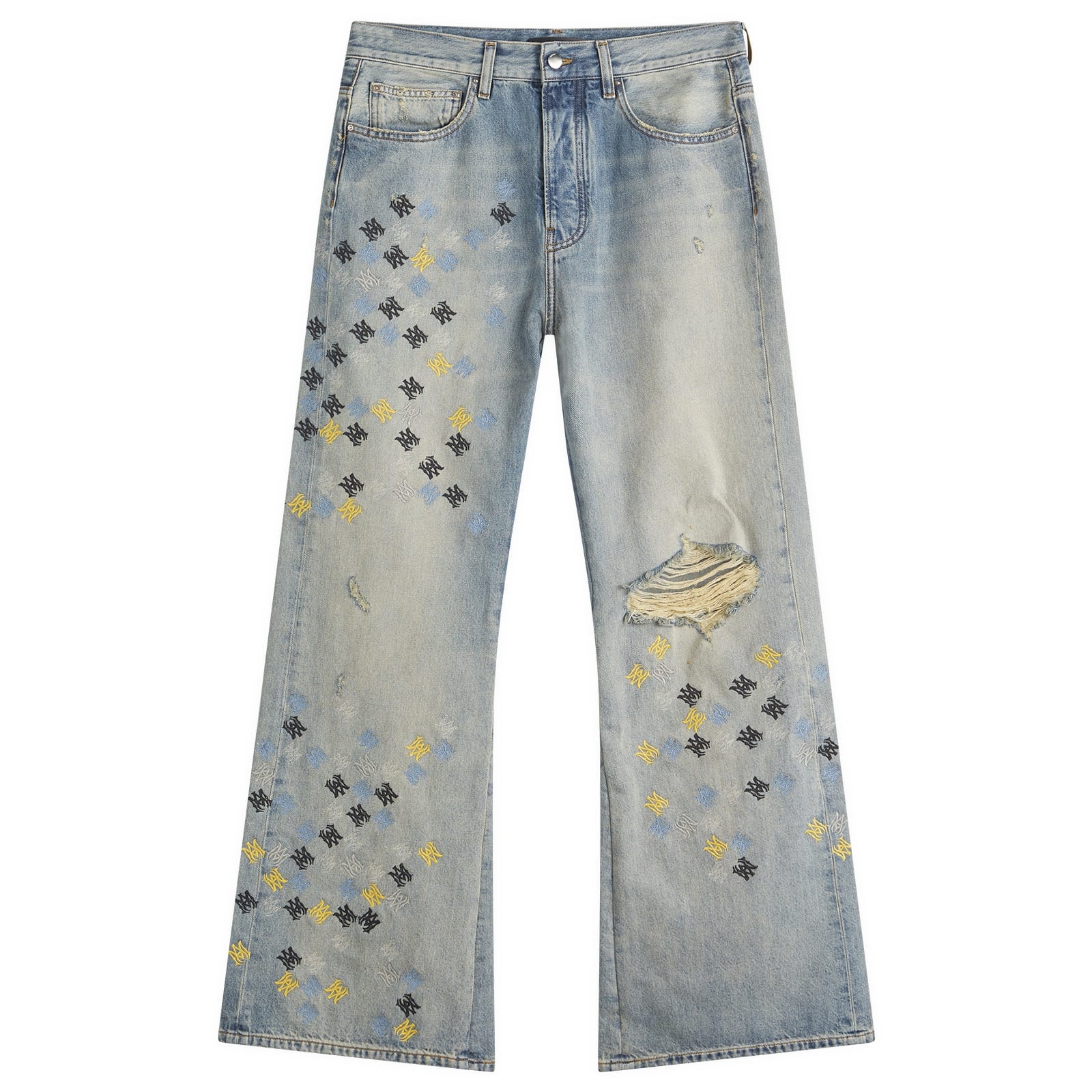 Cut using an Italian stretch-denim fabric, these AMIRI Wide Leg Jeans are washed with an antique indigo effect for a vintage look. With abrasions throughout for a distressed aesthetic, contrasting MA embroidery features throughout. - 92% Cotton, 6 % Elastomultiester 2% Elastane - Zip & Button Fly - 5 Pocket Detailing - Made in USA