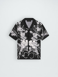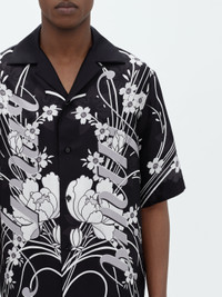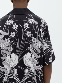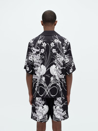 A SYMPHONIC RENDERING OF BLOOMS TAKES SHAPE IN THIS BOWLING SHIRT IN LIGHTWEIGHT SILK TWILL. FEATURING FRONT BUTTON CLOSURE AND NOTCHED LAPEL, THIS SHIRT'S FLORAL GRAPHIC IS INTERWOVEN WITH TONAL AMIRI CURSIVE LOGO AND PAIRS EFFORTLESSLY WITH THE MATCHING FLORAL DRAWSTRING SHORT OR HOUSE DENIM OPTIONS. MODEL IS 6'1" AND WEARS A SIZE MEDIUM MADE IN ITALY 100% SILK DRY CLEAN RECOMMENDED PRE-FALL 2023 COLLECTION