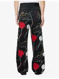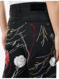 PRODUCT DETAILS - AMIRI denim jeans - 100% cotton - Button and button-fly fastening at front - Baggy fit, mid-rise, straight leg, structured waistband with belt loops, classic five pockets, branded patch at back, branded hardware, all-over floral embroidery, whiskering detailing - Dry clean - Made in Italy - Size UK 32: rise 12.7in / 32.5cm, inside leg 32.2in / 82cm, leg opening 21.2in / 54cm - Model is 6ft 2in/1.88m and wears a size UK 32 - Midweight, non-stretch Ref: R04521053