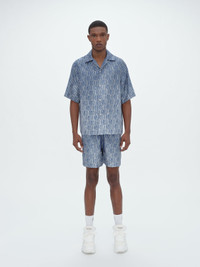 CRAFTED WITH UTMOST COMFORT IN MIND, THESE SHORTS IN VIVID ALL-OVER AMIRI LOGO GRADIENT GRAPHIC TRANSLATE LOUNGEWEAR STANDARDS IN SUBTLY SHINY SILK TWILL. THESE SHORTS ARE FINISHED WITH AN ELASTIC WAIST WITH ADJUSTABLE DRAWCORD AND PAIR EFFORTLESSLY WITH THE MATCHING AMIRI GRADIENT BOWLING SHIRT. MODEL IS 6'1" AND WEARS A SIZE MEDIUM MADE IN ITALY 100% SILK DRY CLEAN RECOMMENDED