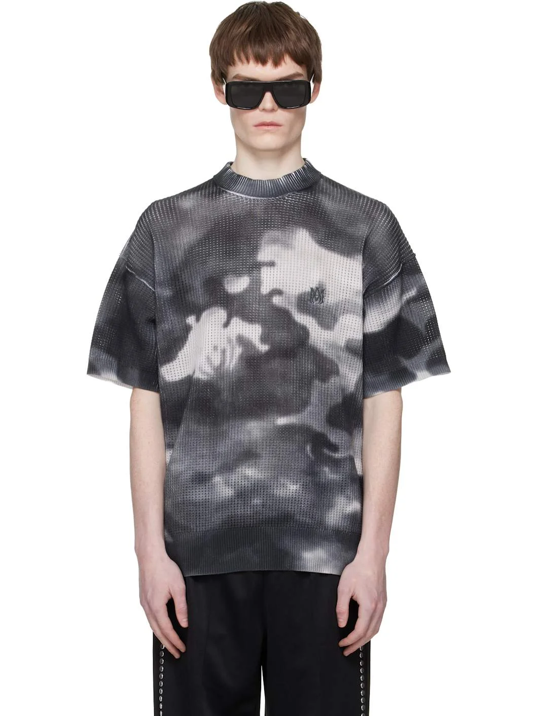 Oversized cotton mesh T-shirt. · Camouflage pattern printed throughout · Rib-knit crewneck, hem, and cuffs · Logo embroidered at chest · Dropped shoulders Supplier color: Grey 100% cotton. Made in Italy 261886M213000