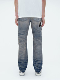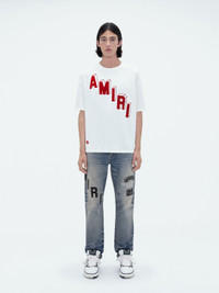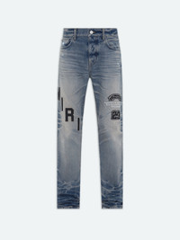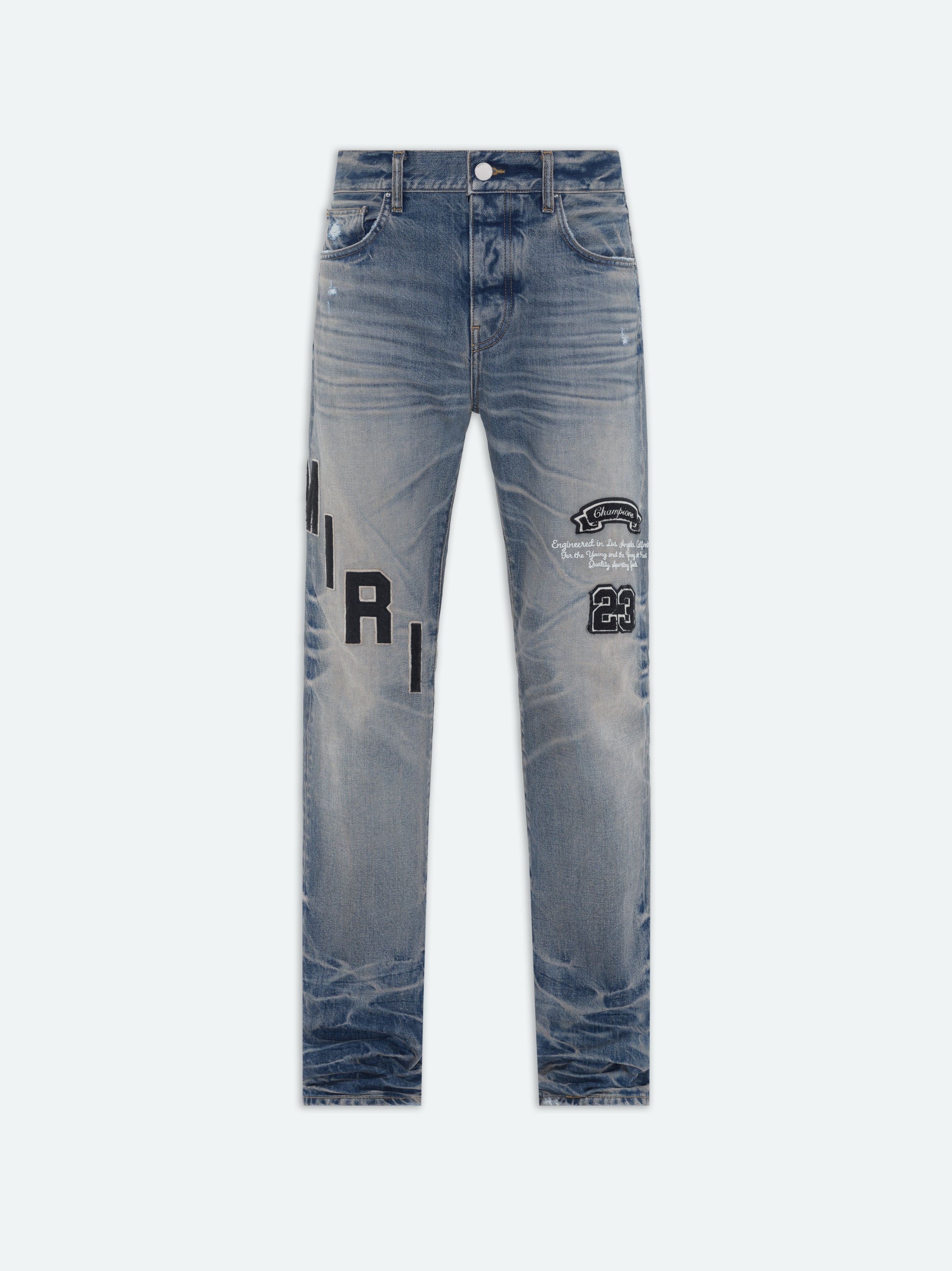 DRAWING FROM VINTAGE AMERICANA AND COLLEGIATE ICONOGRAPHY, THESE JEANS ARE EMBLAZONED WITH THE AMIRI HOCKEY LOGO IN AN APPLIQUÉD FELT TREATMENT. THESE JEANS ARE DESIGNED IN A STRAIGHT FIT WITH CLASSIC FIVE-POCKET CONSTRUCTION AND ARE SPECIALLY WASHED AND TREATED FOR A SUN-FADED EFFECT. FINISHED WITH VARSITY CHENILLE PATCHES, THESE JEANS PAIR WELL WITH HOUSE TEES, KNITS AND OUTERWEAR STYLES. AUTUMN-WINTER 2023 COLLECTION MADE IN USA 100% COTTON DRY CLEAN ONLY