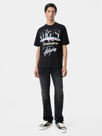 FOR AUTUMN-WINTER 2024, THE PANORAMIC LA SKYLINE CAPTIVATES AMID THE LIGHTS OF HOLLYWOOD. THE HOLLYWOOD LIGHTS TEE FEATURES THE SEASON'S SKYLINE GRAPHIC IN AN AIRBRUSH TREATMENT. AUTUMN-WINTER 2024 COLLECTION MADE IN ITALY 100% COTTON