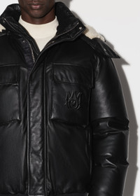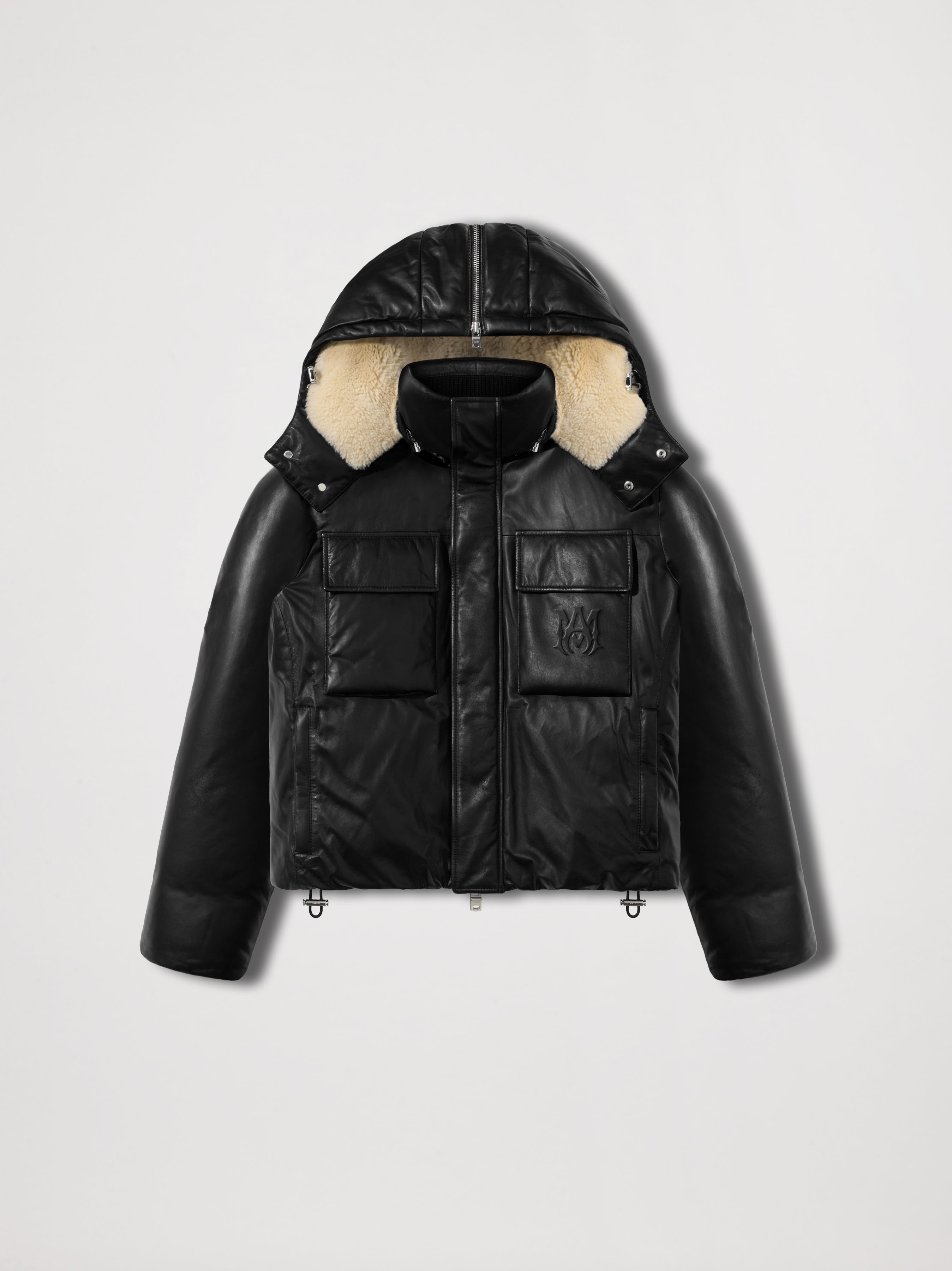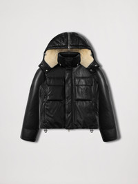HOODED LEATHER DOWN JACKET IN BLACK MADE IN ITALY SHEARLING MODEL HEIGHT 6' 2", 28" WAIST, 34" INSEAM AND IS WEARING SIZE US MEDIUM DETAILS & CARE 98% COTTON, 2% ELASTANE DRY CLEAN RECOMMENDED