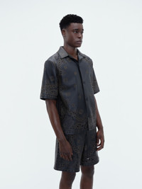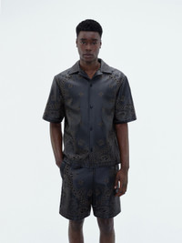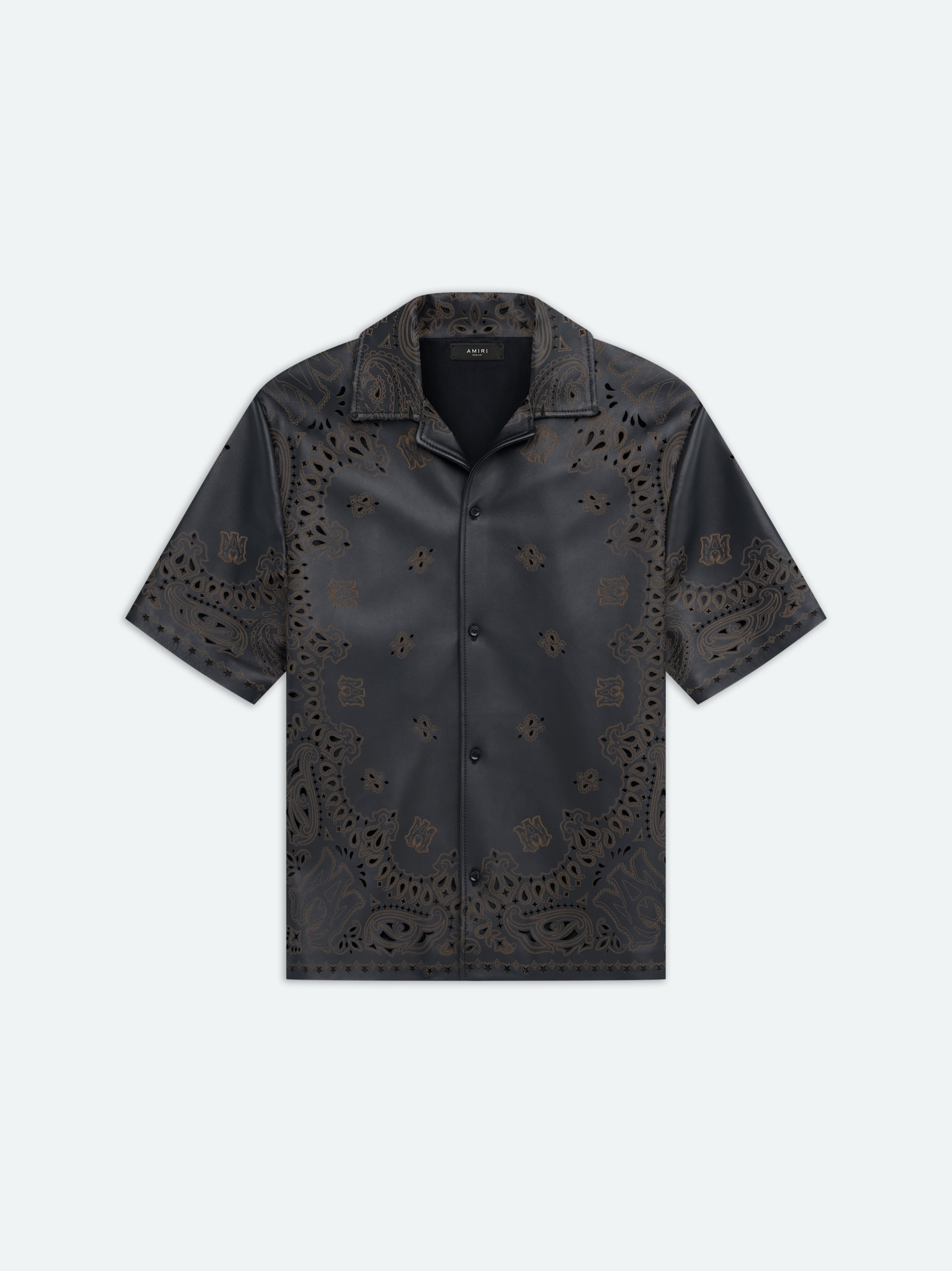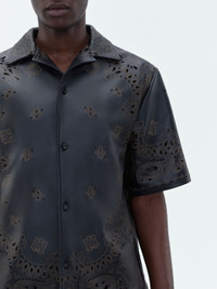 LASER-ETCHED AND PERFORATED BANDANA MOTIFS AND HOUSE ICONOGRAPHY EMBELLISH THIS SHIRT IN SLEEK, STRUCTURED LEATHER. REFERENCING ICONIC AMERICANA EMBLEMS AND TIME-HONORED WESTERN WEAR, THIS SHIRT IS ANCHORED BY A NOTCHED LAPEL AND FRONT BUTTON CLOSURE. PRE-SPRING 2024 COLLECTION MADE IN ITALY 100% LEATHER DRY CLEAN ONLY STYLE:PS24MLS001-001