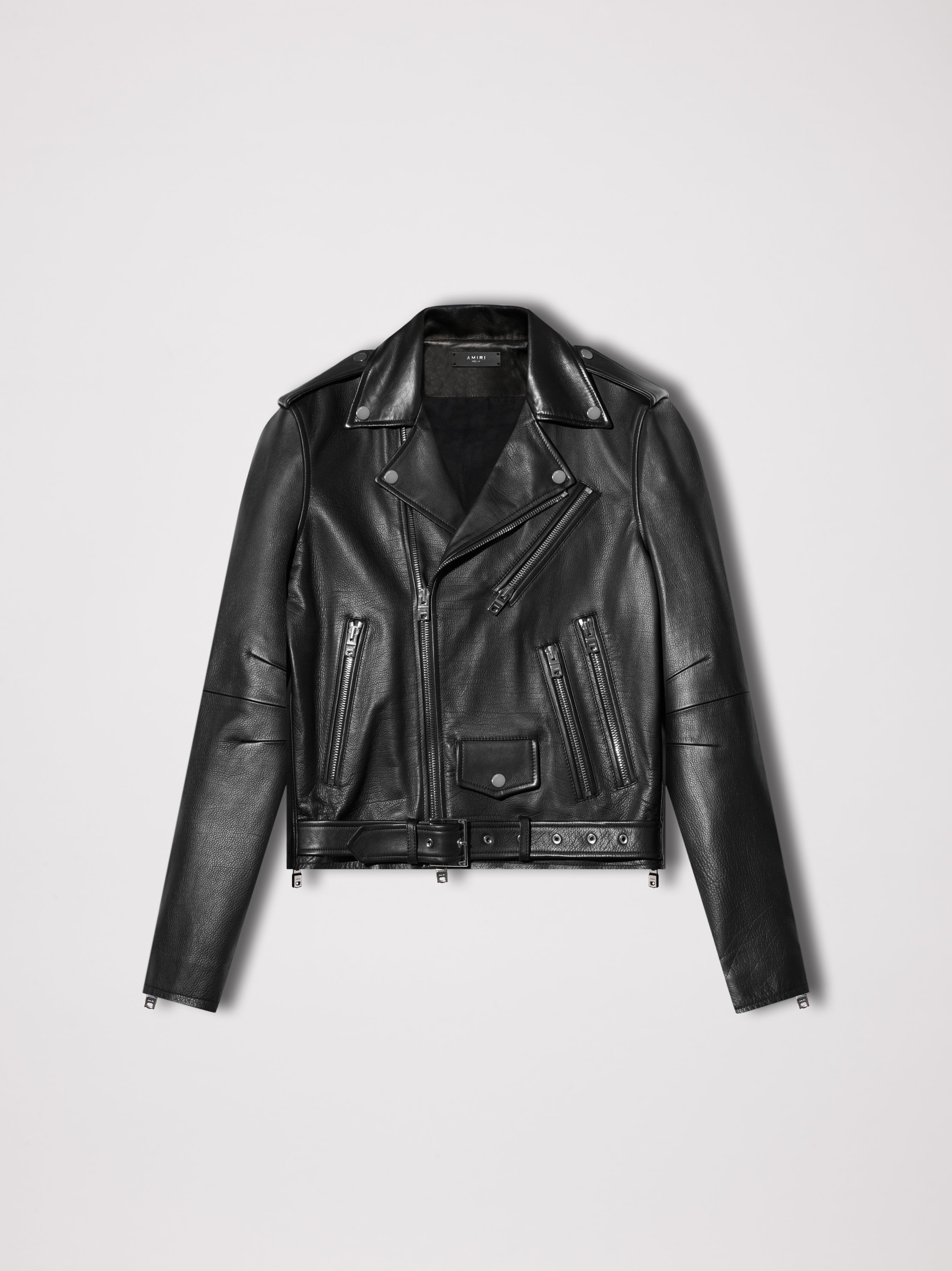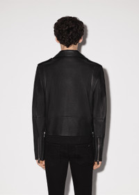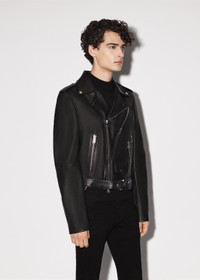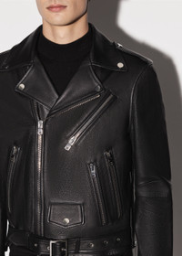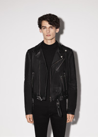 LEATHER BIKER JACKET ADJUSTABLE WAIST BUCKLE BELT BUTTON-CLOSE COIN POCKET INTERIOR ZIP POCKET DETAILS MADE IN ITALY TRUE TO SIZE MODEL WEARS A SIZE 48 FULL LENGTH ZIP CLOSURE ITALIAN PLONGE LEATHER LEATHER SPECIALIST CLEANING RECOMMENDED