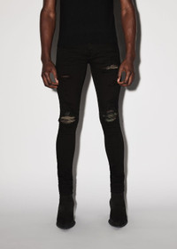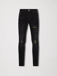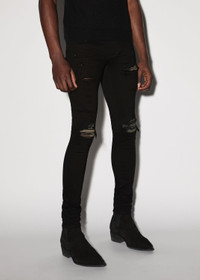PF22 COLLECTION ITALIAN STRETCH DENIM. FEATURING CAMO LEATHER DISTRESSED PATCHES. CLASSIC AMIRI 5 POCKET JEAN MADE IN LOS ANGELES, CA CLASSIC SKINNY LEG FIT MODEL IS 6'2" AND WEARS A SIZE 29 WE RECOMMEND SIZING UP FOR A LOOSER FIT DETAILS & CARE BUTTON FLY 92% COTTON 6% ELASTOMULTIESTER 2% ELASTANE SPOT CLEAN ONLY