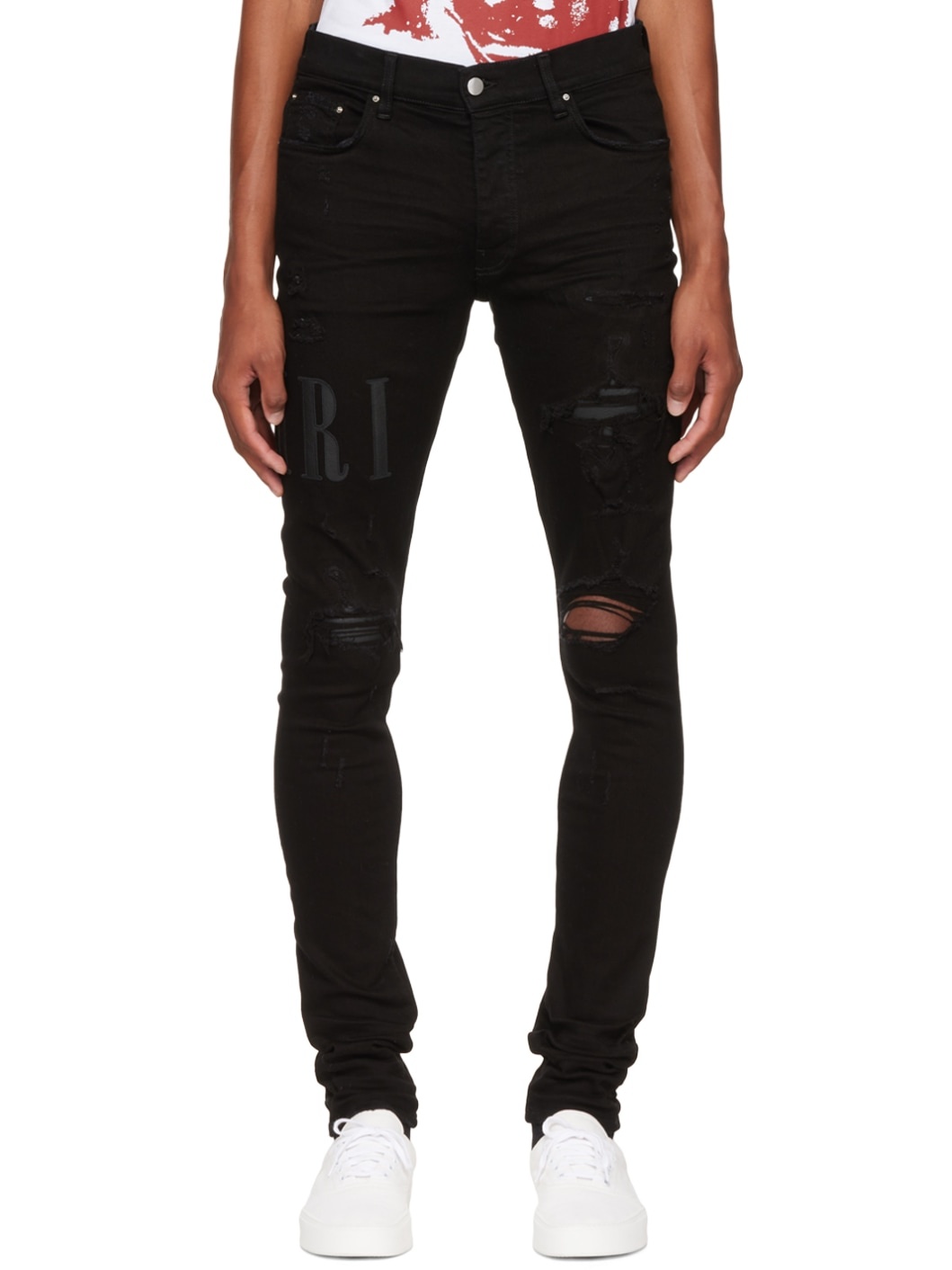 Slim-fit 12oz stretch denim jeans. Fading, whiskering, and distressing throughout. · Belt loops · Five-pocket styling · Button-fly · Grained leather logo appliqué at side · Leather logo patch at back waistband · Logo-engraved silver-tone hardware Supplier color: Black 92% cotton, 6% elastomeister, 2% elastane.