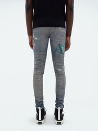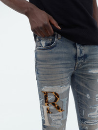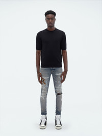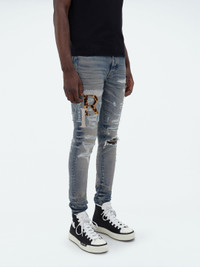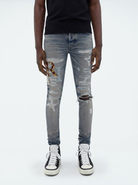 A TAPESTRY OF LEATHER FRAGMENTS EMBELLISH THESE JEANS IN SKINNY-FIT STRETCH ITALIAN DENIM. APPEARING AS THE SEASON'S STAGGERED AMIRI LOGO, PATCHES ARE APPLIQUÉD UPON JEANS THAT HAVE BEEN ARTFULLY WASHED, DESTROYED AND PATCHED IN THE SPIRIT OF WELL-WORN VINTAGE DENIM. THESE JEANS ARE FINISHED WITH CLASSIC FIVE-POCKET CONSTRUCTION AND PAIR SEAMLESSLY WITH THE SEASON'S KNIT AND TEE OFFERINGS. AUTUMN-WINTER 2023 COLLECTION MADE IN USA 92% COTTON 6% ELASTOMULTIESTER 2% ELASTANE DRY CLEAN ONLY
