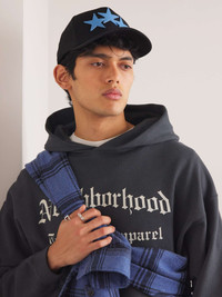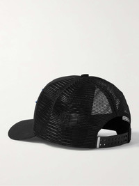 Mike Amiri often pays homage to the subcultures that defined his adolescence - the trucker hat being a crucial element of his teen uniform. This style is made from panels of mesh and cotton-twill and is decorated with a leather three-star motif across the front. It'll complement the brand's signature distressed denim nicely. Size & Fit - Crown Height: 11cm / 4.3in - Circumference: 57cm / 22.4in - Brim Width: 7cm / 2.8in Details & Care - Black cotton-canvas and mesh, light-blue leather - Fabric1: 100% cotton; fabric2: 100% Lyocell; fabric3: 100% polyester; trim: 100% leather
