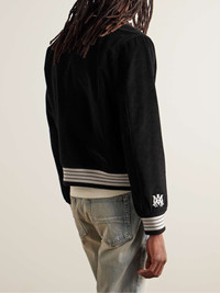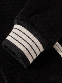Varsity jackets are a staple in AMIRI’s collections, and this version features classic details like striped ribbed trims and a chenille logo patch. It's made from fine-wale cotton-blend corduroy and has contrasting white leather accents. Size & Fit - Fits true to size. Take your normal size - Designed for a regular fit - Slightly short in length - Ribbed hem - Mid-weight, non-stretchy fabric - Model is shown wearing a M - Model measures: chest 38"/ 96cm, height 6'2"/ 188cm Details & Care - Black cotton-blend corduroy, white leather - Snap fastenings - 98% cotton, 2% elastane; trim: 100% leather (Sheep); lining: 100% viscose - Dry clean