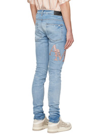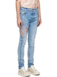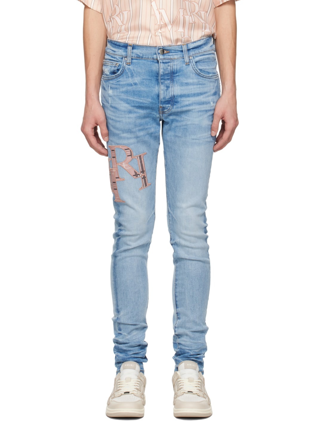 Skinny-fit stretch denim jeans. Fading, whiskering, and subtle distressing throughout. · Belt loops · Five-pocket styling · Button-fly · Flannel logo appliqués at leg · Logo patch at back waistband · Logo plaque at back pocket · Contrast stitching in tan Supplier color: Perfect indigo
