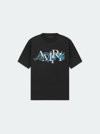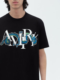 THIS COTTON TEE HONORS THE YEAR OF THE DRAGON WITH A FIERCE MYTHICAL SERPENT ENCIRCLING THE AMIRI LOGO. DESIGNED IN AN EASY, RELAXED FIT, THIS TEE PAIRS WELL WITH HOUSE DENIM OFFERINGS. PRE-SPRING 2024 COLLECTION MADE IN USA 100% COTTON DRY CLEAN ONLY