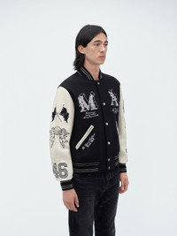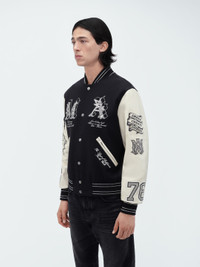 THE SEASON'S VARSITY JACKET REWORKS VINTAGE COLLEGIATE STYLINGS, PAYING HOMAGE TO THE SPIRIT OF CALIFORNIA. EMBLEMS OF BOUNDLESS OPTIMISM, ANGELS APPEAR IN DIMENSIONAL CHENILLE APPLIQUÉ, WHILE CHAIN STITCH EMBROIDERY COMMEMORATES THE HOUSE'S HOME STATE. CONSTRUCTED FROM DURABLE WOOL MELTON WITH LEATHER CONTRAST SLEEVES, FINISHING ELEMENTS INCLUDE BANDED RIB DETAILING, WELT ZIPPER POCKETS AND CLASSIC SNAP BUTTON CLOSURE. THIS HEIRLOOM PIECE IS FINISHED WITH AN EMBROIDERED TRIBUTE TO DREAMERS — THOSE WHO MOVE EVER-FORWARD, BELIEVING THAT ANYTHING IS POSSIBLE. SPRING-SUMMER 2024 COLLECTION MADE IN ITALY WOOL SHELL, LEATHER SLEEVES, VISCOSE LINING DRY CLEAN