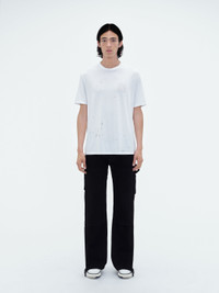 THIS TEE IN LIGHTWEIGHT COTTON FORGES NEW EXPLORATIONS IN MATERIAL DISTORTION THROUGH A SPECIALIZED BATTLEWORN TREATMENT. THIS DISTRESSED APPEARANCE IS PART OF A LEGACY TRACING BACK TO THE HOUSE'S EARLIEST DAYS, DURING WHICH MIKE AMIRI SPENT TIME IN THE CALIFORNIA DESERT EXAMINING GUNFIRE AS A MEANS TO ALTER FABRIC. HOUSE ICONOGRAPHY APPEARS IN SUBTLE MONOCHROME, ALMOST AS IF EMERGING THROUGH A HAZE OF GUNSMOKE. THIS HOODIE COMPLEMENTS HOUSE DENIM OFFERINGS, OR WEAR WITH THE MA LOGO SHOTGUN SWEATSHORT FOR AN STRIKING YET UNDERSTATED LOOK. PRE-SPRING 2024 COLLECTION MADE IN USA 100% COTTON DRY CLEAN ONLY