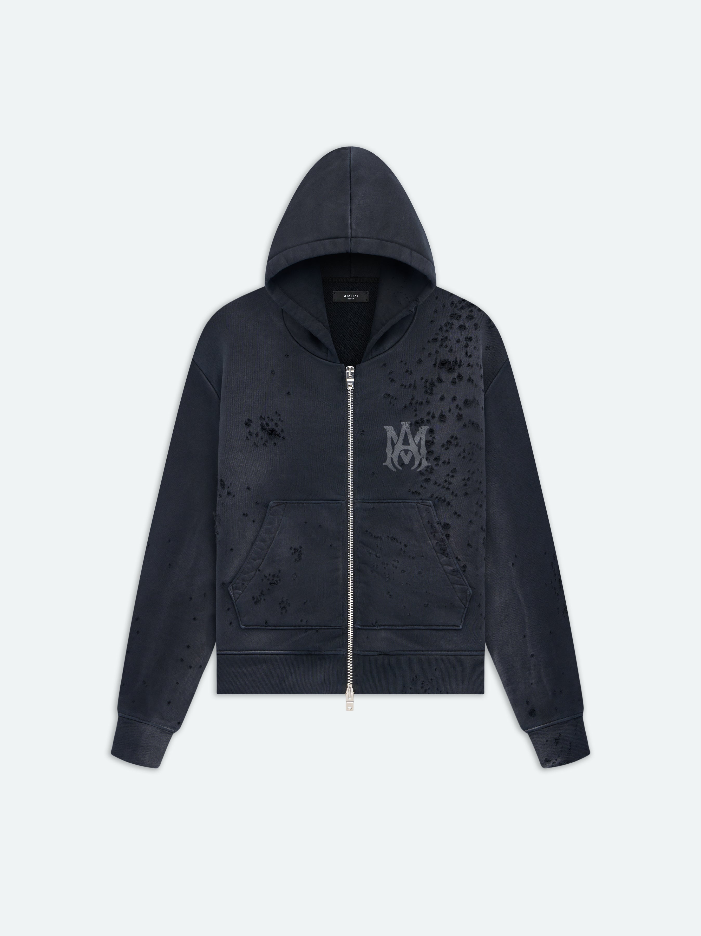 FORGING NEW EXPLORATIONS IN TEXTURAL DISTORTION, THIS HOODIE IS ARTFULLY DISTRESSED IN A SPECIALIZED BATTLEWORN TREATMENT. THIS HOODIE IS CRAFTED FROM SOFT, STURDY COTTON SPECIALLY WASHED FOR A WELL-WORN EFFECT AND IS FINISHED WITH HOUSE LOGO ACCENTS. THIS HOODIE COMPLEMENTS HOUSE DENIM OFFERINGS, OR WEAR WITH THE MA LOGO SHOTGUN SWEATSHORT FOR AN STRIKING YET UNDERSTATED LOOK. PRE-SPRING 2024 COLLECTION MADE IN USA 100% COTTON DRY CLEAN ONLY