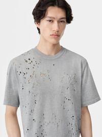 THE HOUSE'S JERSEY OFFERING FORGES NEW EXPLORATIONS IN MATERIAL DISTORTION THROUGH A SIGNATURE BATTLEWORN TREATMENT. THE MA SHOTGUN EMBROIDERED TEE IS DISTRESSED AND EMBROIDERED WITH HOUSE LOGO GRAPHICS ON THE CHEST AND BACK. CORE COLLECTION MADE IN ITALY 100% COTTON