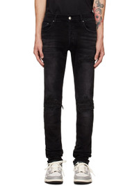 Non-stretch denim jeans. Fading, whiskering, and hand-distressing throughout. · Belt loops · Five-pocket styling · Button-fly · Quilted underlay with jacquard paisley pattern at rips · Leather logo patch at back waistband · Logo plaque at back pocket · Silver-tone logo-engraved hardware Supplier color: Vintage black