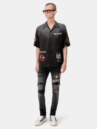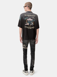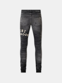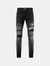 FOR PRE-FALL 2025, MOTIFS PAY HOMAGE TO THE STORIED VENUES OF HOLLYWOOD BOULEVARD. THE AMIRI HOLLYWOOD REPAIRED JEAN IN ITALIAN STRETCH DENIM IS HAND-DISTRESSED AND ILLUSTRATED WITH FLOCKED LETTERING. PRE-FALL 2025 COLLECTION MADE IN USA 92% COTTON, 6% ELASTOMULTIESTERE, 2% ELASTANE THIS GARMENT HAS UNDERGONE A SPECIAL PROCESS WHICH RESULTS IN INTENTIONAL VARIATIONS OF SHADING AND COLOR, AND ADD TO THE PIECE'S UNIQUE CHARACTERISTICS. THIS MAY LEAD TO BLEEDING OR DYE TRANSFER. PLEASE USE CAUTION WHEN WASHING OR DRY-CLEANING THIS ITEM STYLE:AMDNSY1152-051 SIZE & FIT MODEL IS WEARING SIZE 30 MODEL MEASUREMENTS: HEIGHT: 6’2” CHEST: 38" WAIST: 28" HIP: 34.5" PRODUCT MEASUREMENTS (SIZE 30): WAIST: 31" RISE: 10.25" HIP: 37" INSEAM: 34"