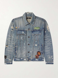 AMIRI's denim trucker jacket looks like the handiwork of a cool DIY project. Distressed to look vintage, it's embellished with enamel pins and hand-sanded appliques and features an oversized 'Pegasus' patch at the back that's artfully repurposed from the label's tees. Size & Fit - Fits true to size. Take your normal size - Designed for a relaxed fit - Mid-weight, non-stretchy fabric - Model is shown wearing a M - Model measures: chest 38"/ 96cm, height 6'2"/ 188cm Details & Care - Blue denim - Button fastenings - 100% cotton - Dry clean - Designer wash: Antique Indigo