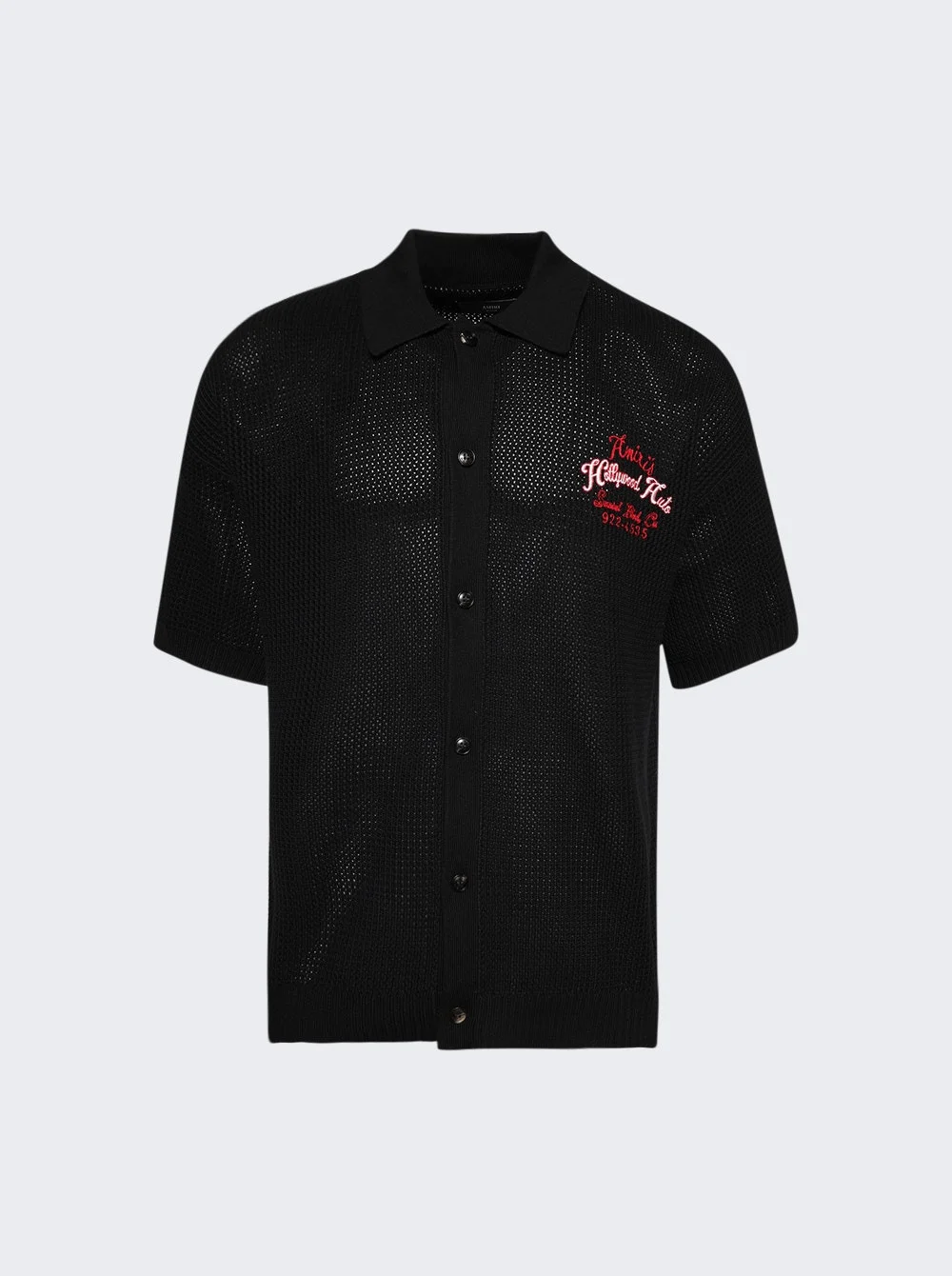 Details - Mesh knit shirt - Embroidered Hollywood Auto motif - Chain stitch embroidery - Ribbed accents - Button-down closure - Material: 100% Cotton Size Information: Vendor Color Code: Brand Style: AMKNIR1028 Designer/Brand: AMIRI