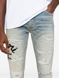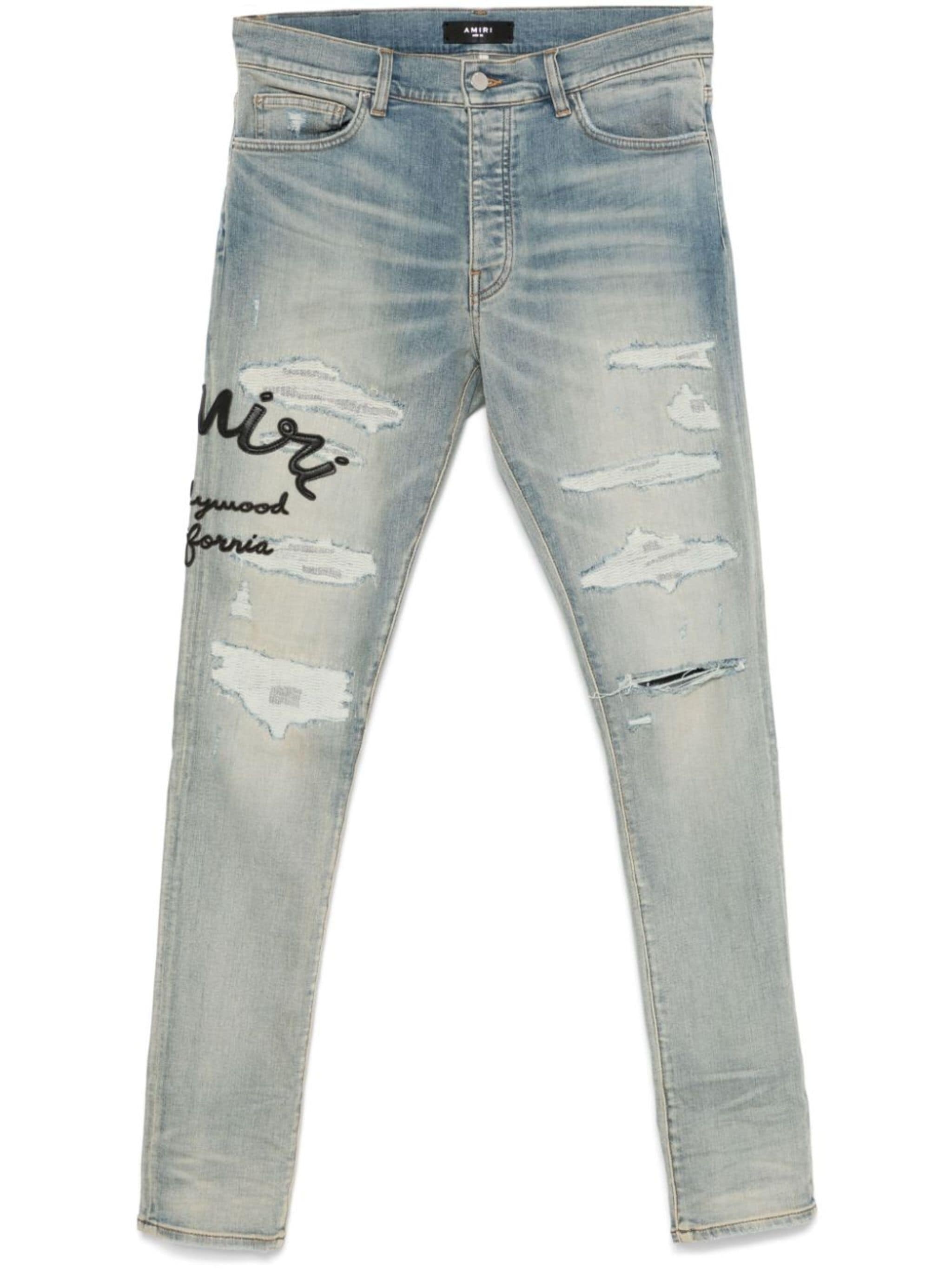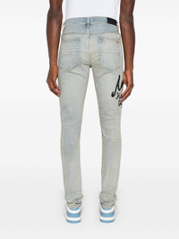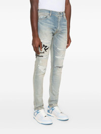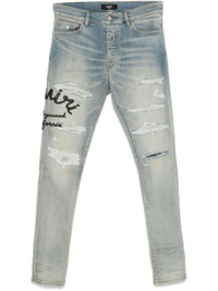 light blue cotton blend washed denim stretch-design distressed effect concealed front button fastening mid-rise contrast stitching belt loops classic five pockets whiskering effect at the thighs logo patch to the side logo patch to the rear skinny cut Size & Fit Model Measurements: Height: 1.88 m Bust/Chest: 94.0 cm Hips: 92.0 cm Waist: 74.0 cm Model wears size 32/34 Fabric and Care Designer Style ID: AMDNSY1087 Designer Colour: 406 ANTIQUE INDIGO Composition: Polyester 6%, Cotton 92%, Spandex/elastane 2% Washing instructions: Do Not Wash/Do Not Dry Clean Made in United States