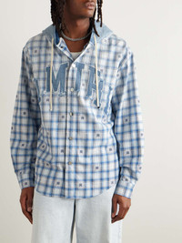 AMIRI's overshirt is made from checked cotton-flannel interspersed with the brand's logo. It's detailed with a faded denim hood and appliqued with a distressed moniker across the chest. Size & Fit - Those who are above 6'1"/ 185cm may wish to take the next size up - Designed for a relaxed fit - Mid-weight, non-stretchy fabric - Model is shown wearing a M/L - Model measures: chest 38"/ 96cm, height 6'0"/ 183cm Details & Care - Tonal-blue, white and black cotton-flannel, blue denim - Snap fastenings - 100% cotton - Spot clean