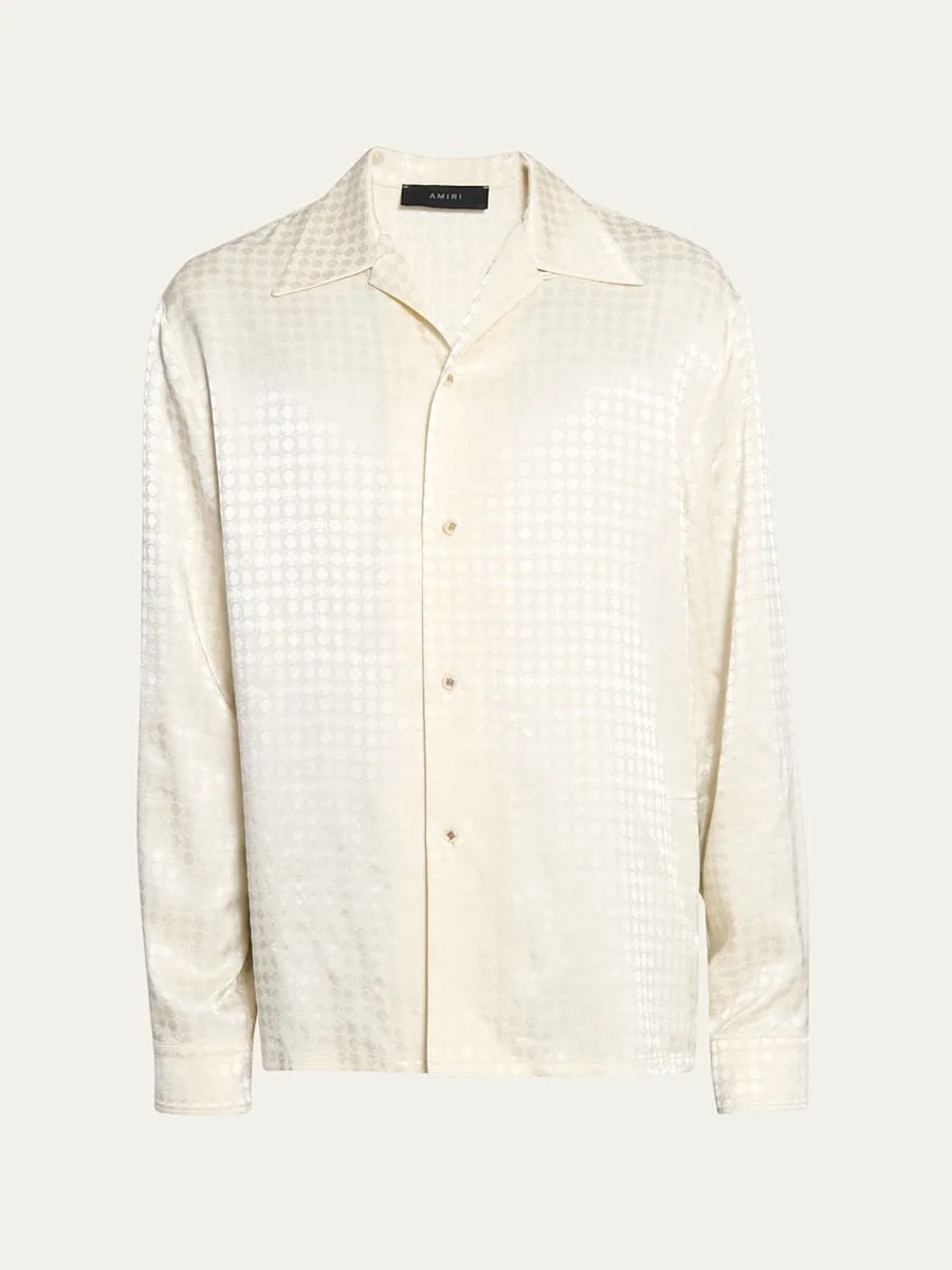 Amiri sport shirt in tonal geometric pattern Camp collar Branded button placket Long sleeves Squared barrel cuffs Relaxed fit Viscose Dry clean Made in Italy Model is 6'1"/185cm. Online Inquiries: BGS21_NCFMV| Store Inquiries: #4875261