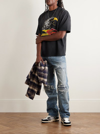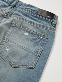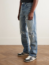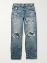 This straight-leg version of AMIRI's signature 'MX1' jeans are cut from blue denim that's ripped and repaired with tonal ribbed panels. They're heavily faded and whiskered and feature a black leather logo patch at the back. Size & Fit - Fits true to size. Take your normal size - Regular-straight leg, low-crotch style - Mid-weight, non-stretchy fabric - Model is shown wearing a 32 - Model measures: waist size 32, height 6'2/ 188cm Details & Care - Blue denim - Button fastenings - 100% cotton - Dry clean - Designer wash: Honeycomb Indigo