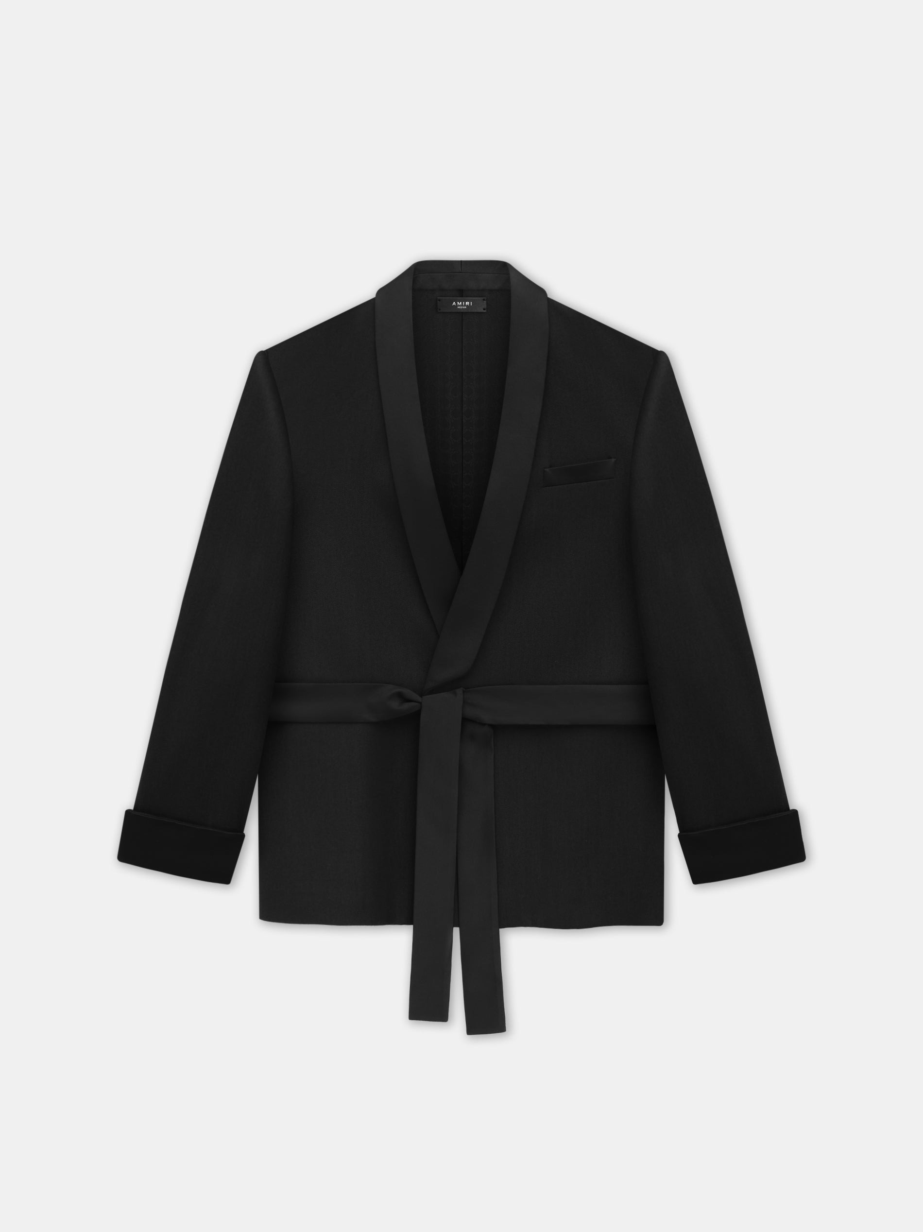 AUTUMN-WINTER 2024 PRESENTS NEW SILHOUETTES THAT TRANSLATE MID-CENTURY SUITING THROUGH THE HOUSE'S DISTINCTIVE POINT OF VIEW. THE SMOKING JACKET IS CRAFTED IN CUSTOM-WOVEN WOOL BLEND WITH WELT POCKETS, SELF-TIE WAIST, AND CONCEALED SINGLE-BUTTON CLOSURE. AUTUMN-WINTER 2024 COLLECTION MADE IN ITALY 63% WOOL, 37% VISCOSE STYLE:AMSUCJ1009-001 SIZE & FIT MODEL IS WEARING SIZE "48" MODEL MEASUREMENTS: HEIGHT: 6'1.5 CHEST: 35.5" WAIST: 27.5" PRODUCT MEASUREMENTS: CHEST: 50" SHOULDER: 18.25" LENGTH: 32.75" SLEEVE LENGTH: 36"