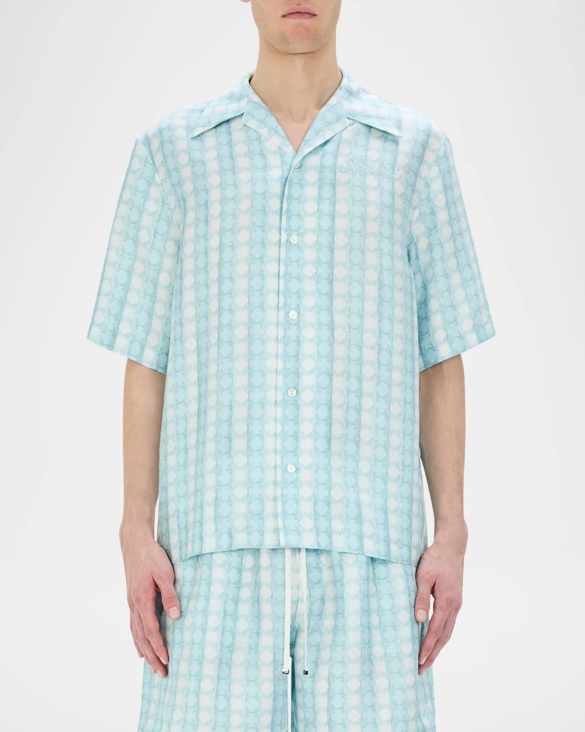 - Amiri bowling shirt in luxe silk showcasing the allover MA Quad print - Logo signature on the chest - Notch collar - Button placket - Short sleeves - Straight hem - Boxy fit - Silk - Dry clean - Made in Italy
