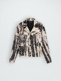 THIS JACKET FORMS A PLAY IN SCALE AND TEXTURE THROUGH MINIATURE PRINTS AND LARGE-SCALE TEXTILE TREATMENTS. THE MA ICON AND SIGNATURE PAISLEY MOTIF COALESCE IN A RHYTHMIC SCHEME WHILE BLEACH EFFECT ADDS DIMENSION AND DIY SENSIBILITY. FINISHED WITH A SPREAD COLLAR, BUTTON DOWN CLOSURE AND FRONT FLAP POCKETS, THIS JACKET PAIRS WITH THE BLEACHED MA PAISLEY UTILITY PANT FOR A COORDINATED LOOK. MODEL IS 6'1" AND WEARS A SIZE 46 MADE IN ITALY 88% WOOL, 9% NYLON, 3% EA DRY CLEAN RECOMMENDED