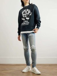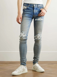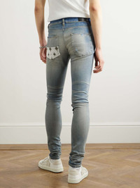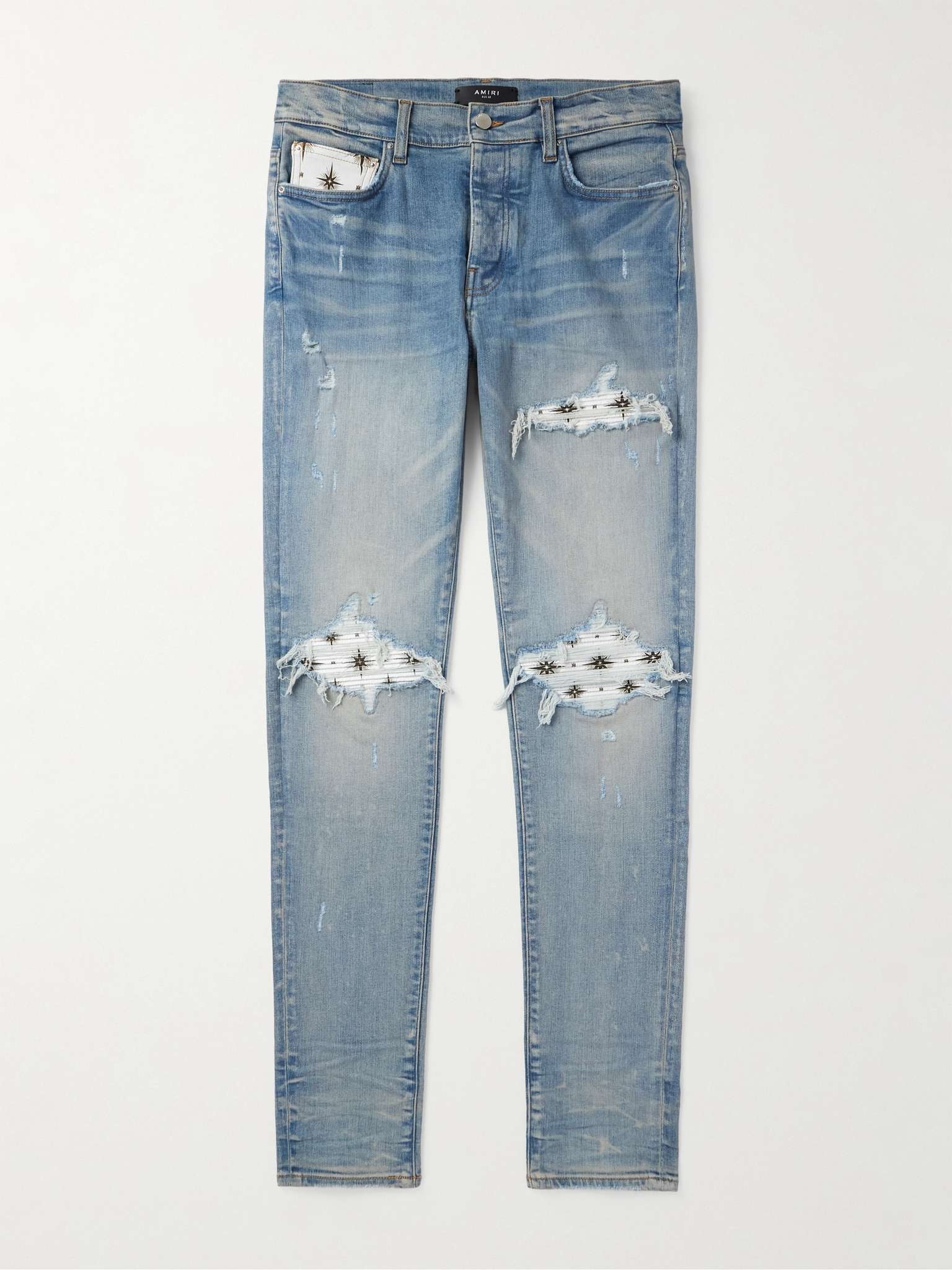 It can take up to three months to create AMIRI's 'MX1' jeans, a process the label likens to surgery as they're heavily distressed, then reassembled. This pair is cut from stretch-denim with a little give and has ripped panels backed with the signature 'Mirco Starbust' fabric, which is inspired by mid-century Americana. Size & Fit - Fits true to size. Take your normal size - Skinny leg, mid-rise style - Mid-weight, slightly stretchy fabric - Model is shown wearing a 30 - Model measures: waist size 30, height 6'2"/ 188cm Details & Care - Blue denim - Button fastenings - 92% cotton, 6% elastomultiester, 2% elastane