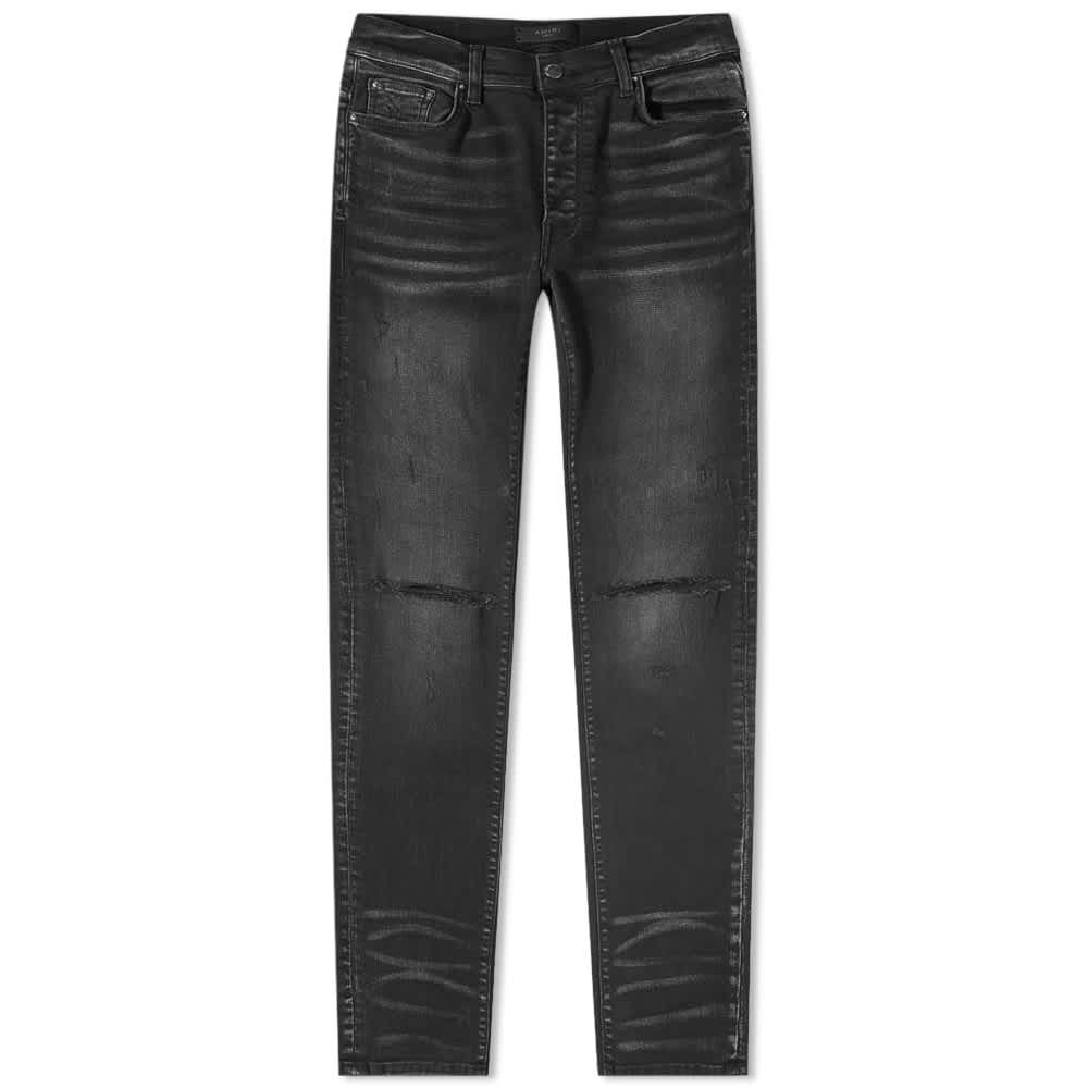 Designed with AMIRI’s signature grunge aesthetic in mind, these black jeans are distressed with slashes at the knees and washed for a vintage rock n’ roll feel. Made in the USA from a stretchy cotton blend, they’re cut to a slim fit, then topped off with a tonal leather brand patch on the back of the waistband for a subtle hint of brand appeal. - 92% Cotton, 6% Polyester, 2% Elastane - Slim Fit - 5 Pocket Set-up - Button Fly - Distressed Details - Leather Brand Patch - Made in USA