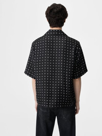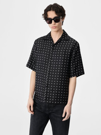HOUSE SIGNATURE MOTIFS FORM NEW PATTERNS THROUGH A PLAY IN SCALE. THE MIX AND MATCH MA SHIRT IN LIGHTWEIGHT SILK FEATURES AN MA ICON PRINT AND IS FINISHED WITH A CLASSIC NOTCHED LAPEL AND BUTTON-DOWN CONSTRUCTION. CORE COLLECTION MADE IN ITALY 100% SILK STYLE:AMSTBW1020-001 SIZE & FIT MODEL IS WEARING SIZE "M" MODEL MEASUREMENTS: HEIGHT: 6'3 CHEST: 34" WAIST: 30" HIP: 36" PRODUCT MEASUREMENTS: CHEST: 44" SHOULDER: 18" LENGTH: 27.5" SLEEVE LENGTH: 12.5"