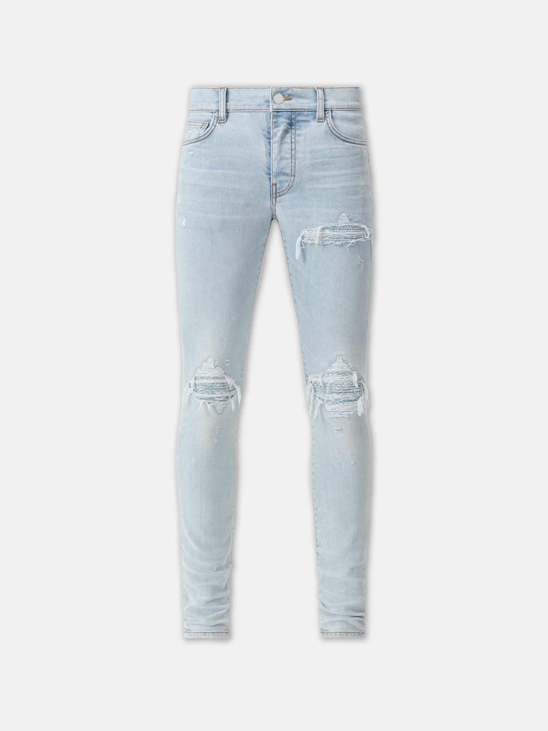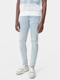 FOR PRE-FALL 2024 MENSWEAR, DENIM BECOMES A CANVAS FOR INTRICATE PATTERNING AND NOVEL FABRICATION PROCESSES. THE MX1 BANDANA JACQUARD JEAN IS DESIGNED IN ITALIAN STRETCH DENIM THAT HAS BEEN HAND-DISTRESSED AND REPAIRED WITH PLEATED BANDANA JACQUARD DENIM. PRE-FALL 2024 COLLECTION MADE IN USA 92% COTTON, 6% ELASTOMULTIESTERE, 2% ELASTANE