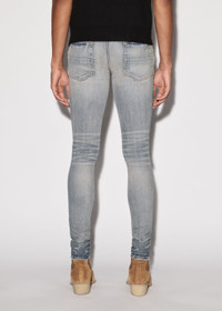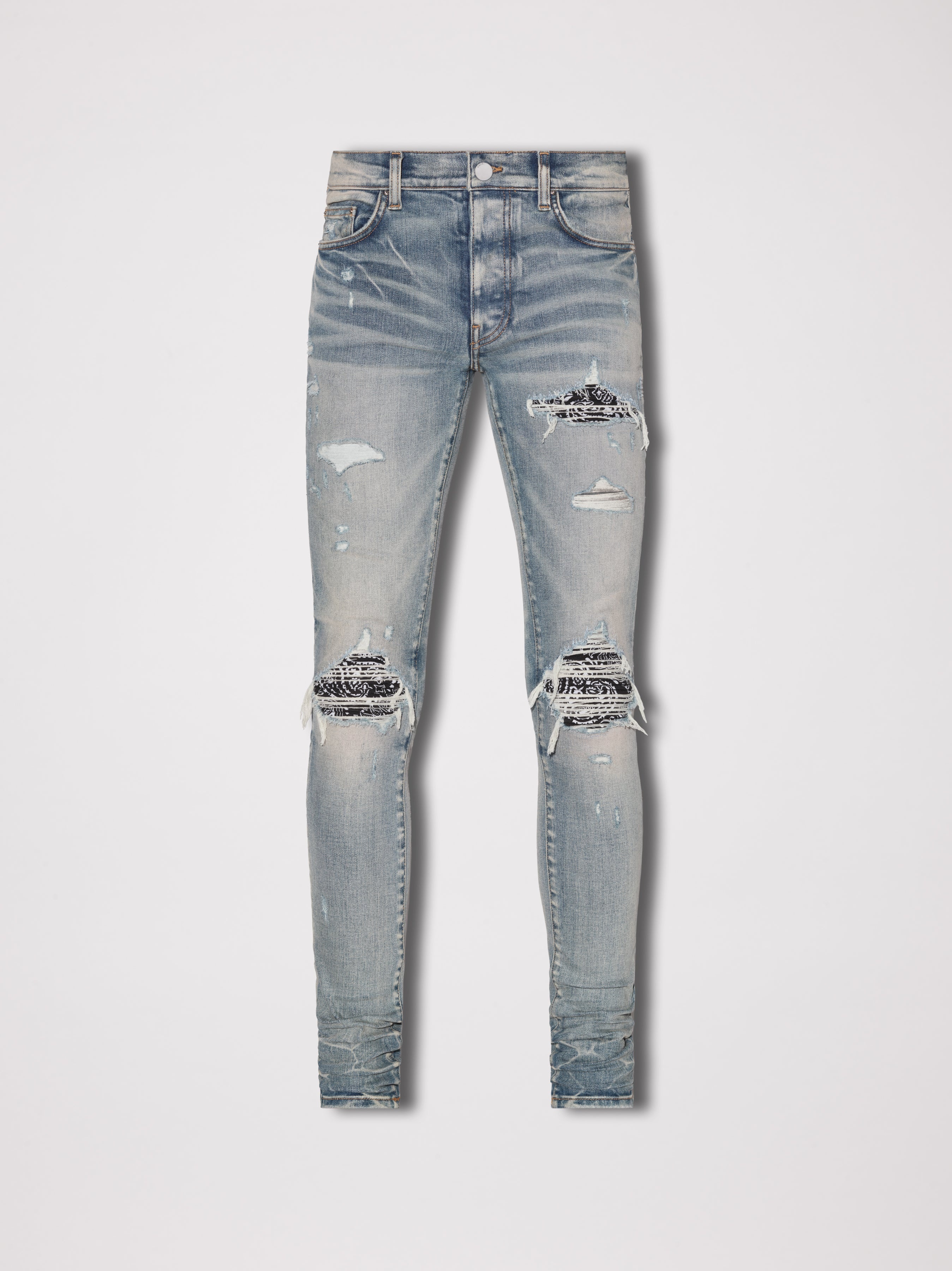 DISTRESSED ITALIAN DENIM SKINNY JEANS ABRASIONS AND DISTRESSING THROUGHOUT BANDANA PATCHES AT KNEES CLASSIC AMIRI 5 POCKET JEAN MADE IN LOS ANGELES, CALIFORNIA CLASSIC SKINNY LEG FIT MODEL WEARS A SIZE 29 WE RECOMMEND SIZING UP FOR A LOOSER FIT BUTTON FLY ITALIAN STRETCH DENIM SPOT CLEAN ONLY