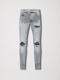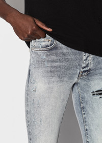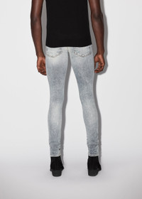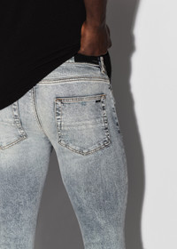 JEANS IN STONE INDIGO MADE IN USA 12 OZ ITALIAN STRETCH DENIM MODEL HEIGHT 6' 2", 28" WAIST, 34" INSEAM AND IS WEARING SIZE US 29 92% COTTON 6% ELASTOMULTIESTER 2% ELASTANE DRY CLEAN RECOMMENDED