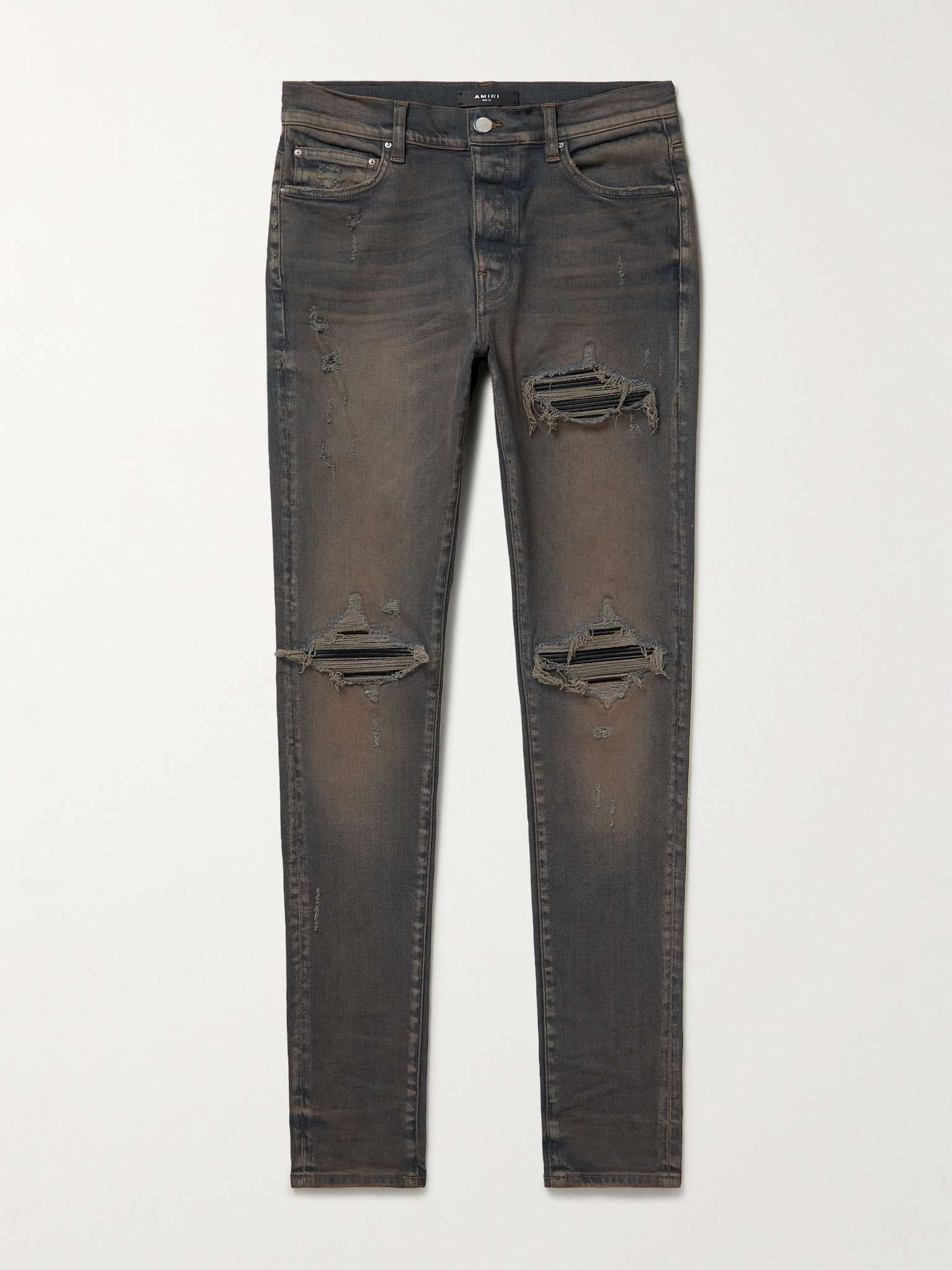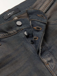 AMIRI compares making its jeans to surgery - each pair is destroyed, then carefully reassembled in a process that can take up to three months. This skinny 'MX1' style is cut from flexible stretch-denim that's ripped and repaired with panels. Small to size. See Size & Fit notes. Size & Fit - Fits small to size. Take one size larger than normal - Skinny leg, mid-rise style - Mid-weight, stretchy fabric - Model is shown wearing a 33 - Model measures: waist size 32, height 6'2"/ 188cm Details & Care - Blue stretch-denim - Button fastenings - 92% cotton, 6% elastomultiester, 2% elastane; trim: 100% leather (Cow) - Designer wash: Dark Indigo