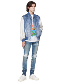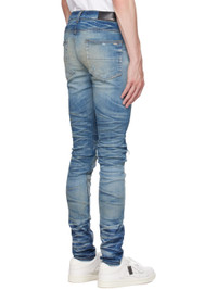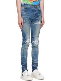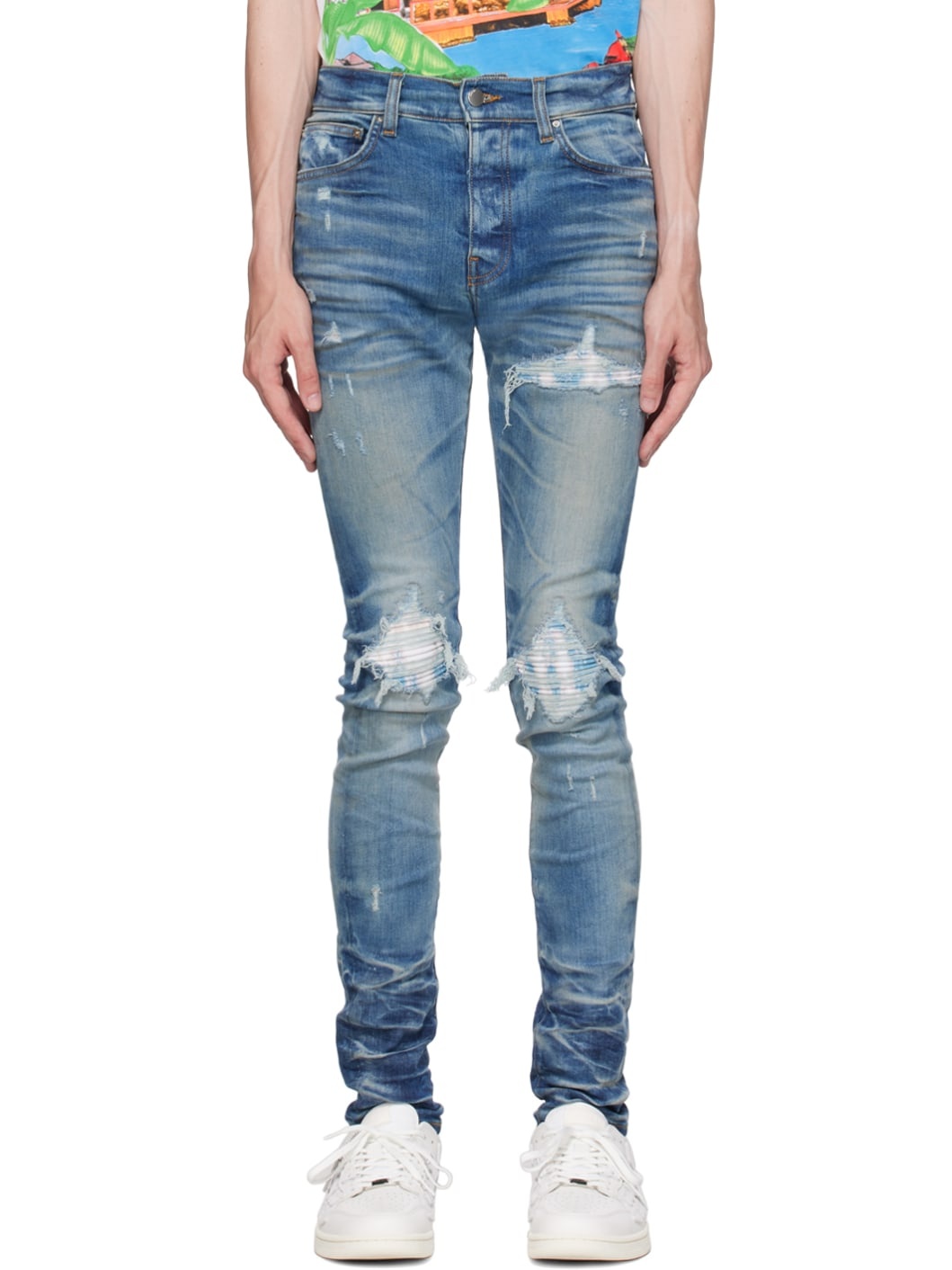 Stretch denim jeans. Fading and distressing throughout. · Belt loops · Five-pocket styling · Button-fly · Panels with tie-dye effect at front · Leather logo patch at back waistband · Contrast stitching in tan Supplier color: Vintage indigo